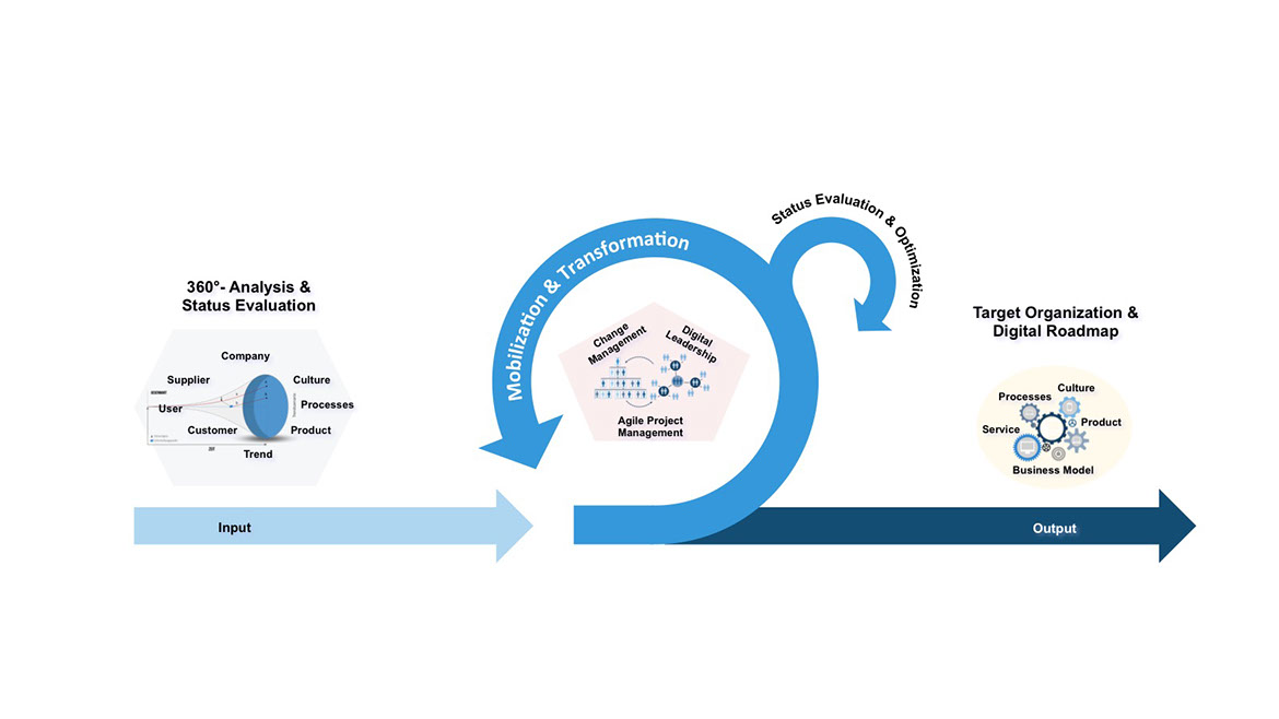 Based on the M&C - Management-System we evaluate the company by an 360°-Analysis of the business model, processes, products, culture (digital level of maturity), environment and we reflect on the major trends to assess the status of the company (readiness check). Together with you we develop the target organization and the company-individual digital roadmap. The agile project management, the operative experience of the M&C Change Manager and the mobilization of Digital Leadership within the organization guarantees the successful implementation of the digital roadmap to fulfill the agreed targets. The continuous verification of status and targets assures consistent target achievement and further optimization.